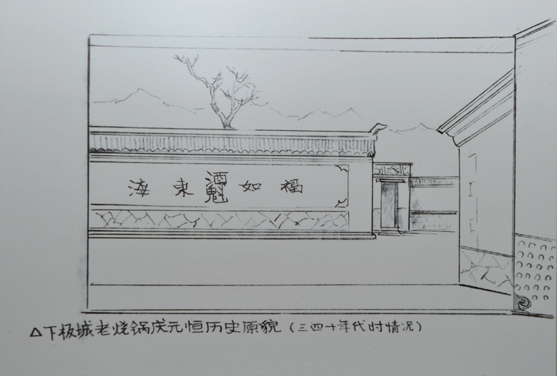 關(guān)闊去日本時,發(fā)現(xiàn)了日本專門研究承德的學(xué)者伊東佑信先生早年在承德畫的速寫里,有兩幅1940年前后的下板城老燒鍋慶元亨的實景記錄,非常真實。