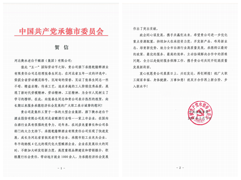 河北衡水老白干釀酒集團收到一封來自承德市委的賀信,賀信主要內容是對河北衡水老白干釀酒集團子公司承德乾隆醉酒業(yè)(板城酒業(yè))黨委書記、總經(jīng)理張春生榮獲“全省勞動模范”稱號表示祝賀。祝賀信中講到:“張春生同志一絲不茍、精益求精,傳承工藝、追求卓越的工人階級優(yōu)秀品質,展現(xiàn)了新時代勞模精神、勞動精神、工匠精神,為全市人民樹立了榜樣,近年來,企業(yè)在發(fā)展壯大的同時,不斷加大研發(fā)創(chuàng)新力度,高度重視品牌建設和營銷推介,積極履行社會責任,帶動地方就業(yè)1000余人,為承德經(jīng)濟社會發(fā)展作出了突出貢獻。”張春生作為制造業(yè)(工業(yè)領域)的翹楚,先后獲省“三三三人才工程”人選、河北省企業(yè)家協(xié)會先進工作者、河北省食品行業(yè)年度人物、中國商業(yè)聯(lián)合會科學技術獎、全國商業(yè)科技進步獎-特等獎、2020年與2022年度分別榮獲河北省優(yōu)秀民營企業(yè)家等多項榮譽。