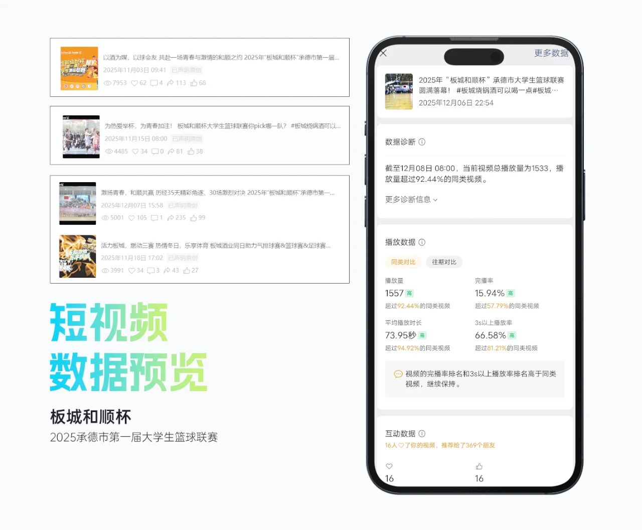 整體活動影響力顯著,賽事抖音曝光超214萬,累計(jì)觀看直播人數(shù)超15萬人,現(xiàn)場累計(jì)吸引觀眾逾2萬人次,承德市籃球協(xié)會微信公眾號相關(guān)閱讀量超2萬人次,板城酒業(yè)視頻號平臺相關(guān)播放量超2.5萬人次。