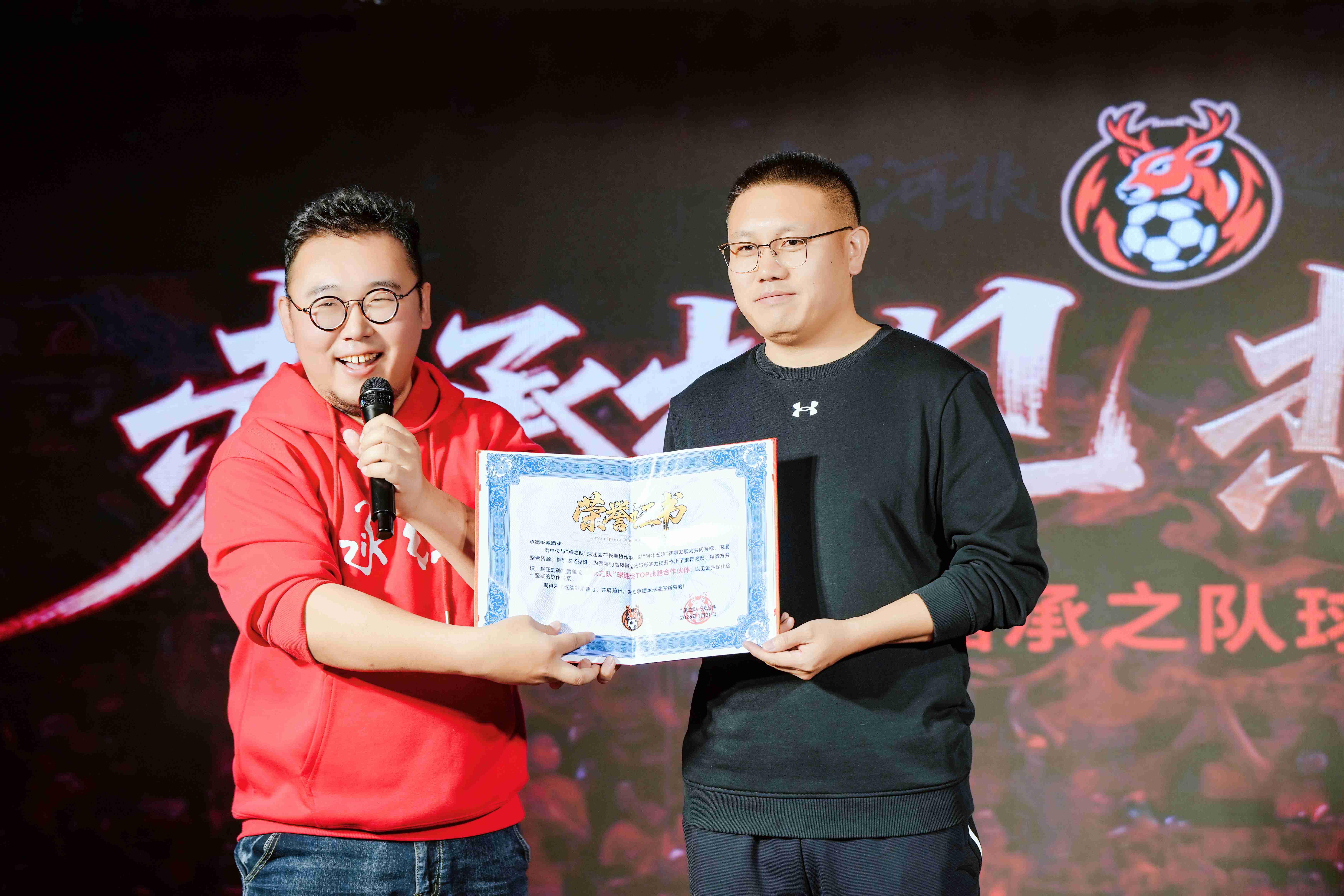 致辭結(jié)束后,現(xiàn)場舉行了授牌儀式,承德新鮮事兒創(chuàng)始人、“承之隊”球迷負(fù)責(zé)人朱孟博向板城酒業(yè)授予了“TOP戰(zhàn)略合作伙伴”榮譽(yù)證書,以表彰其長期以來的鼎力支持與深度協(xié)作,共同推動承德足球事業(yè)的發(fā)展。這一榮譽(yù),見證著雙方深厚的情誼與堅實的伙伴關(guān)系。